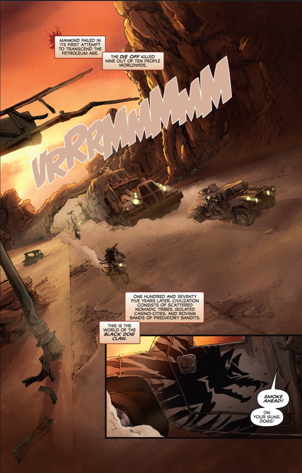 Mankind failed to transcend the Petroleum Age. 175 years after the Die Off, civilization consists of scattered tribes, isolated casino-cities, and hordes of predatory bandits.